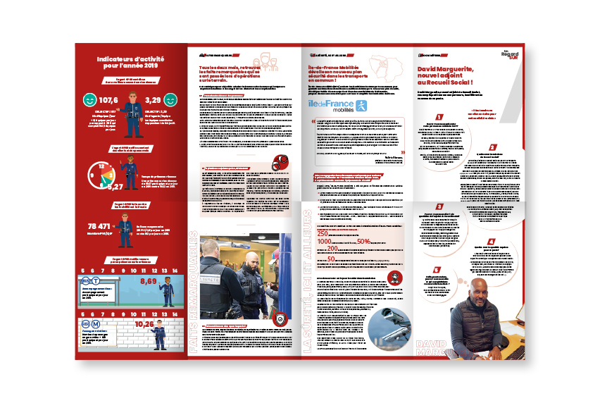 Ayant pour but de communiquer sur toutes les actualités relatives à la sécurité au sein de la RATP, nous avons conçu ce grand format qui, une fois plié, sera facilement transportable. Nous l’avons imaginé pour que les informations soient claires, structurées et compréhensibles par tous les collaborateurs. Graphiques, interviews ou reportages photos viennent ponctuer la lecture.